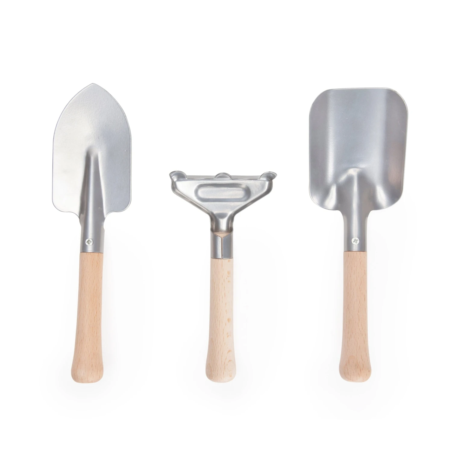 - Rake, spade and shovel with wooden handles and metal finish
