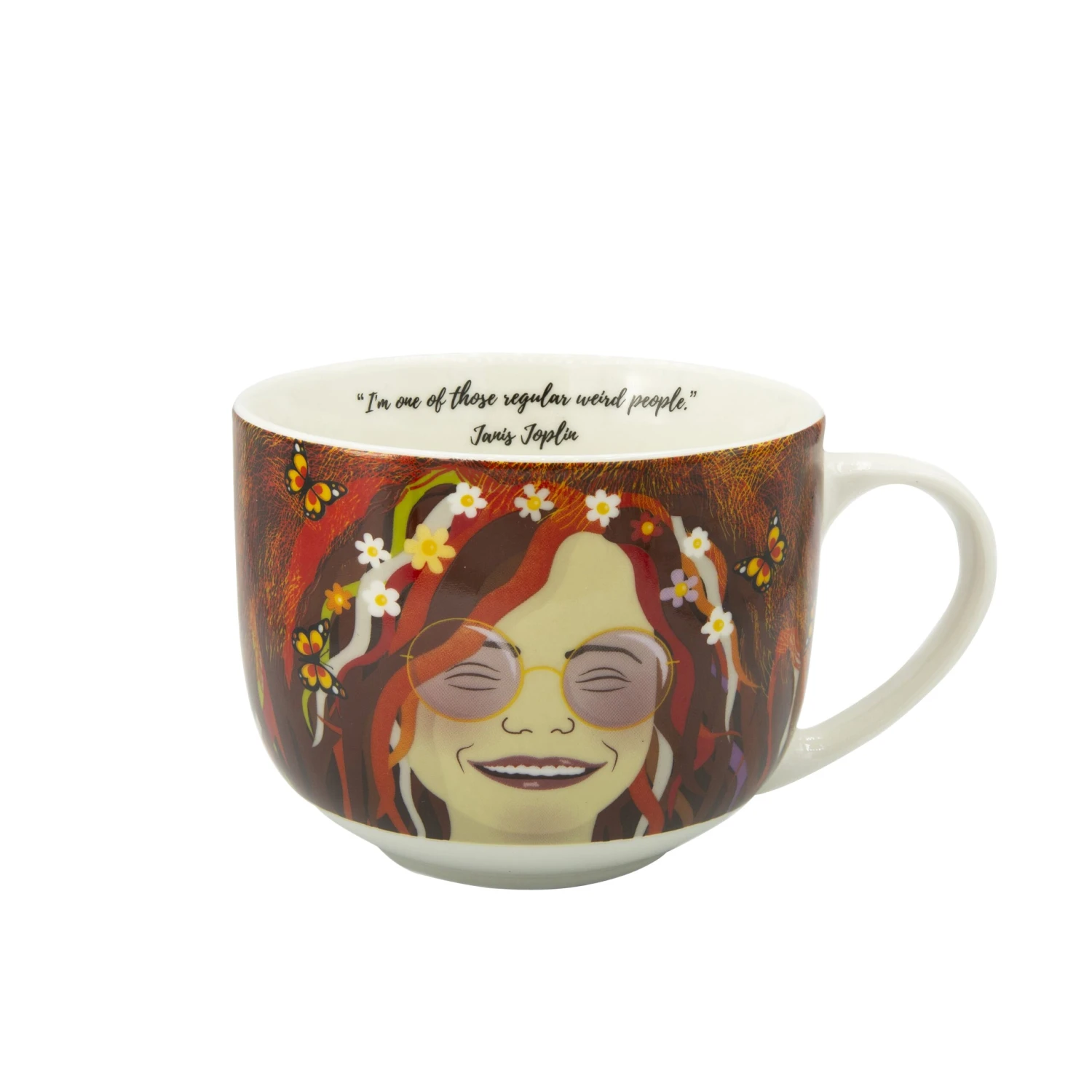 Whether it’s for coffee, tea or soup. The wide-mouth and large handle makes it easy to enjoy your drink! And with every sip you will enjoy the inspirational quote inside the rim. I’m one of those regular weird people – Janis Joplin.