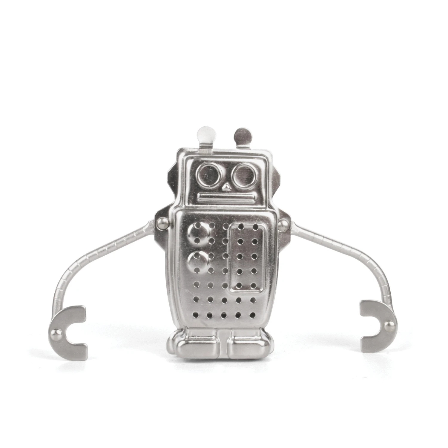 The robot shaped stainless steel tea infuser has adjustable arms to fit any size mug. Includes infuser tray that acts as a saucer when removed.